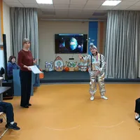 Детская библиотека Маяк отправилась в гости к студентам Омутнинского политехнического техникума на квартирник, посвящённый дню космонавтики «Звезды. Космос. Гаг