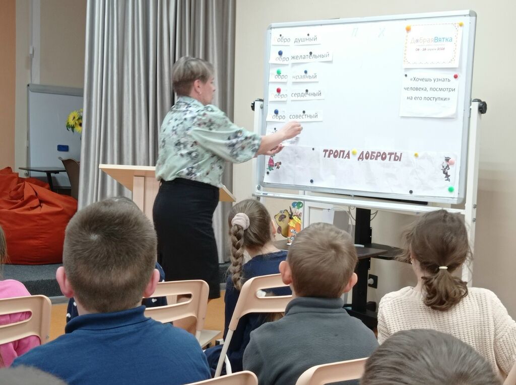 Когда человек делает добрые дела, на душе у него становится легко. Поэтому каждое совершенное доброе дело одним человеком может воодушевить на добрые дела многих. В рамках марафона добрых территорий «Добрая Вятка-2026» для обучающихся городских школ прошел урок, посвященный добру, поступкам добрым и не очень. Дети рассуждали, что такое хорошо и что такое плохо. На примере литературных сюжетов ребята разобрали поступки хорошие и плохие. Поговорили о волонтерском объединении «По зову сердца», которое работает при Детской библиотеке «Маяк». Вспомнили пословицы и разгадали ребусы о добре, посмотрели м\ф "ПРосто так" и видеролик "О добре и зле". В завершении беседы дети написали свои «добрые поступки» на «следах» и прикрепили их на доску, создавая «Тропу доброты»
